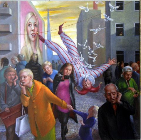 Claudia Hauptmann, Künstlerpech, 2014, Öl und Tempera auf Leinwand, 140 x 140 cm Künstlerpech Das Bild „Künstlerpech“ steht Pate für den Ausstellungstitel und ist eine faszinierende und fesselnde Arbeit. Claudia Hauptmann steht bewußt in der Tradition der ostdeutschen Malerei und erzählt auf unkonventionelle, poetische, verschlüsselte und wiedererkennbare Art und Weise nicht nur die Geschichte vom Künstlerpech des Eulenspiegels, sondern reflektiert die momentane Gesellschaft und deren Wahrnehmungsweise sowie Wirklich- keitsverschiebungen. Künstlerpech ist hier in doppeltem Sinne verankert. Zum einen stürzt der Harlekin vom Seil, auf dem er balancieren wollte, und zum zweiten sieht ihn keiner. Nein, nur das Kind im Vordergrund sieht den Sturz. Alle anderen Figuren realisieren nicht, was um sie herum passiert. Sie sind in einer anderen Realität. Das, was direkt neben, über ihnen passiert, wird nicht wahrgenommen. Die Frau in der Mitte fotografiert aus dem Bild heraus, wodurch eine Rückkopplung zum Betrachter erfolgt. Poetisch, symbolisch und zugleich surreal können die weißen Tauben gelesen werden. Sie verkörpern die ungehörte und ungesehende Botschaft des Künstlers, der nicht nur unterhalten, sondern etwas mitteilen wollte. Das überdimensionierte Werbeplakat an der Häuserwand hinterfragt nicht nur die Flut von Werbung, sondern thematisiert Schönheitsideale und Träume unserer Gesellschaft. Claudia Hauptmann gelingt es, das Jetzt und Gesellschaftliches subtil und zugleich direkt zu zeigen und zusätzlich stehen ihre Bilder natürlich in einem kunsthistorischen Kontext. Der Betrachter kann Motive entziffern, Bildideen entschlüsseln, Zusammenhänge auftun und sich schlichtweg auf eine intellektuelle und sinnliche Anregung einlassen. Neben der technischen und kompositorischen Versiertheit ist dies eine Melange, die man sehr selten antrifft. Diese Malerin beherrscht lässig das Augentäuschende und zeigt ihr Können in der Lebendigkeit, der Sinnlichkeit, der Materialität. Doch noch wichtiger ist, dass sie die Transformation der erlebten Welt in eine erzählerische und ganz individuelle, moderne und zugleich klassische Bildwelt souverän meistert. Claudia Hauptmann malt und zeichnet Akte, Stillleben und Portraits seit ihrem 14ten Lebensjahr. Anfangs in Eisenach im Zeichenzirkel, dann in den 80er Jahren an der Abendschule der HGB in Leipzig, danach im Studium an der Burg Giebichenstein in Halle, wo sie Meisterschülerin bei Gudrun Brüne war. Es ist die siebte Einzelausstellung, die wir mit Claudia Hauptmann bestreiten, und wir freuen uns sehr, dass wir wieder neue Werke und damit die Entwicklung der Künstlerin zeigen können. Sabine Elsner, Leipzig, Oktober 2014 Wir laden sehr herzlich zur Eröffnung am Freitag, 07. November 2014 von 18 bis 22 Uhr in die Galerie ARTAe, Gohliserstraße 3, 1. OG ein. Mehr zu Claudia Hauptmann Galerie ARTAe Gohliser Straße 3 / 1. OG 04105 Leipzig Öffnungszeiten: Mittwoch - Samstag, 15 - 19 Uhr und nach Vereinbarung Haltestelle "Nordplatz / Michaeliskirche" Linie 12 Haltestelle "Chausseehaus" Linie 16 und 11 Showroom Galerie ARTAe Menckestraße 3 04155 Leipzig Öffnungszeiten: Freitag 20 - 22 Uhr, Samstag, 10 - 12 Uhr und nach Vereinbarung  |