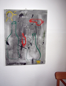 THOMAS KAPIELSKI Noderne Gunst 09.03. - 29.04.2012, Galerie ARTAe Leipzig Eröffnung am Freitag, 09. März 2012 von 18 – 22 Uhr Einführung gegen 19 Uhr, Guillaume Paoli, Philosoph, Soziologe und Publizist Der Künstler ist anwesend LESEFRÜHSCHOPPEN VOL. 3 / 17.März 2012, ab 11 Uhr Thomas Kapielski, Jürgen Roth, Bamberger Bier und Weisswurst Sonderöffnungszeiten zum Frühjahrsrundgang der Leipziger Galerien: Samstag und Sonntag, von 11 bis 19 Uhr ![]() ![]() Noderne Gunst Der Berliner Schriftsteller Thomas Kapielski war in den vergangen Jahren ein Stammgast der Galerie in Sachen Literatur, in Bierangelegenheiten oder als Laudator einer Ausstellungseröffnung. Doch diesmal ist etwas anders. Der mit dem Preis der Deutschen Literaturhäuser 2010 geehrte Kapielski ist ein Meister des Wortes und ein genial- dilletierendes Universalgenie! TK macht Musik (u.a. im Original Oberkreuzberger Nasenflötenorchester), er fotografiert, malt und bastelt, ist also auch bildender Künstler. Und eben diesen präsentieren wir nun zum ersten mal in Leipzig. Ab dem 9. März 2012 sind einige seiner kleinen und großen Meisterwerke der Alltagsgegenstände, des Grotesken, des Wortspiels und subversiven Kunst- Kunst unter dem Titel „Noderne Gunst“ in der ARTAe Galerie zu bewundern. Nach eigenen Angaben entstehen diese Arbeiten nach langem Sammeln und Konzipieren recht flott auf wenigen Quadrat- metern in seiner Küche. Und eben diese schnelle und freie Umsetzung bereitet dem geneigten Betrachter ein freudiges, hintersinniges und befreiendes Vergnügen. Denn sicherlich ist die liebe Kunst ungemein wichtig, sie bildet und setzt sich auseinander und soll den einen oder anderen manchmal sogar immer noch provozieren. Gleichwohl ist die Kunst eben nur Kunst, nicht mehr und nicht weniger und sie ist zu nichts nutze. Kapielskis Arbeiten verweigern sich ohne Anstrengung den gängigen Sprachen, Codes und Klischees der zeitgenössischen Kunst. So kommen bei ihm die essenziellen und nützlichen Dinge oder manchmal einfach nur Da- Seiendes zu Ehren; beispielsweise eine fotografische Reihe von Wandhaken jeglicher Couleur, Lampen oder Hotelbetten. Der gute alte Hausschuh: gewöhnlich einfach nur benutzt, wie selbstverständlich ausgelatscht und anschließend weggeschmissen - bei Kapielski erhält er ein Acrylgebiss und probt den Aufstand auf weichem Geläuf. Auf Papier und Leinwand gibt es dann die feinen Spielereien der Worte und Sprache, kombiniert mit karikaturartigen Zeichnungen und Kritzeleien und mit, aus dem Gewohnt- Dahingesagtem entrissenen Floskeln und Sätzen. Mal mit Bleistift oder Kugelschreiber, mal mit Acryl und Öl. Und dann ist da noch das Abbild. Bei Kapielski folgerichtig und konsequent mündend im, wie er sagt „ultimativen Ölschinken“, einem Frühwerk aus dem Jahre 1984. Literatur und Ölschinken – er reflektiert und seziert unseren Zeitgeist, dessen Absurditäten, Merkwürdigkeiten und Eitelkeiten, im Alltäglichen genauso wie im so genannten Kunstbetrieb. Das Ganze gelingt ohne jeglichen anklagenden oder weinerlich- selbstmitleidigen Ton, ohne Bedeutungshuberei. Vielmehr finden wir ein mildes, wohlwollendes und ebenso selbstironisches Lustigmachen, das entspannt, zurecht rückt und Abstand gewinnen lässt. In diesen Zusammenhang passt auch der Kasseler Literaturpreis für grotesken Humor, den der Künstler 2011 erhielt. Nach Einzelausstellungen in der Kunsthalle Göppingen, der Galerie & Edition Marlene Frei Zürich und der Städtische Galerie Delmenhorst im vergangenen Jahr, freuen wir uns nun sehr auf die „Noderne Gunst“ in Leipzig, auf Thomas Kapielski und ihren Besuch der Ausstellung! Marian Elsner, Februar 2012 Mehr zu / More about Thomas Kapielski Homepage von Thomas Kapielski |