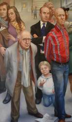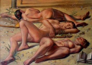 Please scroll down for English version CLAUDIA HAUPTMANN Schlaf der Musen - Malerei 19.3. - 23.5.2009 / Galerie ARTAe Leipzig Eröffnung am Donnerstag, 19. März von 18 – 21 Uhr Mit freundlicher Unterstützung der Rosenbrauerei Pößneck. ![]() ![]() links: Kunstbetrachtung 1, 2008, Öl auf Leiwand, 200 x 120 cm rechts: Schlaf der Musen 3, 2008, Öl auf Hartfaser, 100 x 140 cm Schlaf der Musen Claudia Hauptmann präsentiert wieder ungehörige Motive - klassisch und zugleich provokant, hintergründig, intelligent – das ist Hauptmanns Markenzeichen. Wer sich noch an die ungewöhnliche Darstellung der Pietà oder Medusa der letzten Einzelausstellung in der Galerie ARTAe erinnert, weiss was gemeint ist. Die neun Musen, üblicherweise in wallenden Kleidern, künstlerisch inspirierend, stets gutgelaunt und vor allem schön, werden von Hauptmann als erotische Lustobjekte inszeniert. Haben sich die Töchter des Zeus etwa verausgabt? Schaffen sie es nicht mehr die Schriftsteller, Musiker, Maler anzuregen? Was ist nur mit den Musen los? Leiden die zeitgenössischen Musen etwa am Burnout-syndrom, schlafen sie vor Langeweile oder Ideenlosigkeit, oder sind sie gar in der Leipziger Schule eingenickt? Deutschland, Land der Ideen – haben die ideengebenden Musen eigentlich noch Kraft? Die neun Musen wurden von Hauptmann in einem Triptychon auf eine Länge von 420 cm gemalt und sind erstmals in Leipzig zu sehen. Ebenso eine Premiere in dieser Ausstellung ist das Meisterwerk „Besucher einer Ausstellung“. Wir, als Betrachter werden zum beobachteten Objekt. Kritisch äugt der amerikanische Portraitist, spekulierend ein berühmter Kunstsammler, neugierig ein junges Paar, wissend ein erfahrener Professor und verspielt ein kleiner Junge. Neben der grandiosen Komposition, Vielschichtigkeit und technischen Perfektion besticht dieses Bild durch die simple Frage, wie wir eigentlich Kunst betrachten und schließlich bewerten. Ist es ein Kennerblick, ein spekulativer Blick, ein verspielter.....und wer legt die Kriterien fest. Sabine Aichele-Elsner, Galerie ARTAe Leipzig Ab dem 11. März können die ersten Werke auf Termin vorbesichtigt werden. mehr zu CLAUDIA HAUPTMANN Webseite von CLAUDIA HAUPTMANN CLAUDIA HAUPTMANN Sleep of the Muses – Paintings March 19, 2009 – May 23, 2009 / Gallery ARTAe Leipzig Opening: Thursday, 19 March from 6 to 9 pm The artist will be in attendance. We would be pleased to welcome you! Best wishes, Team of the gallery ARTAe Sabine Aichele-Elsner and Marian Elsner With friendly support of Rosenbrauerei Pößneck GmbH. ![]() ![]() left: Kunstbetrachtung I., 2008, oil on canvas, 79 x 47 inches right: Schlaf der Musen 3 (Sleep of the Muses 3), 2008, oil on wood, 39 x 55 inches Claudia Hauptmann – Sleep of the Muses Claudia Hauptmann presents again, impertinent motifs – classical, and at the same time provoking, profound, and intelligent – that is the trademark of Hauptmann. Those who still remember the unusual representation of the Pietà or the Medusa from the last solo-exhibition in the gallery ARTAe, know what this means. The nine Muses, usually in flowing clothes, artistically inspired, always in a good mood, and above all beautiful, were designed as objects of desire. Have the daughters of Zeus overspent themselves? Do they stimulate the writers, musicians, and painters no longer? What happened with the Muses? Do the contemporary Muses suffer from burnout, or are they sleeping because of boredom or the lack of ideas, or do they even drop out of the “School of Leipzig”? Germany, country of ideas – do the Muses, which are imaginative, actually still maintain their power? The nine Muses were painted by Hauptmann in a triptichon on a length of 165 inches and are showing for the first time in Leipzig. The première of the masterpiece “Kunstbetrachtung 1” is also in this exhibition. We, as viewers get to be the watched object. The American portraitist looks critical, a famous art collector speculates, a young couple is curious, an experienced professor is knowing, and a little boy is playful. Besides the magnificent composition, the variety and the technical perfection of this artwork suggests the simple question: How do we actually look at art and ultimately assess it? Is it the look of an expert, a speculative view, a playful one… and who fixes the criteria? Sabine Aichele-Elsner, Gallery ARTAe Leipzig more about CLAUDIA HAUPTMANN Webside of CLAUDIA HAUPTMANN |