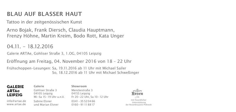 Blau auf blasser Haut Tattoo in der zeitgenössichen Kunst 04.11 - 18.12.2016 Galerie ARTAe Leipzig Gohliser Straße 3, 1. OG / 04105 Leipzig Öffnungszeiten: Mi - Sa 15 - 19 Uhr und nach Vereinbarung (0160-91118817) Teilnehmende Künstler: Arno Bojak / Frank Diersch / Claudia Hauptmann Frenzy Höhne / Martin Kreim / Bodo Rott / Kata Unger kuratiert von Sabine Elsner Eröffnung am Freitag, 04. November 2016 von 18:00 bis 22:00 Uhr ![]() ![]() Blau auf blasser Haut Diese Ausstellung wurde für den Anhaltischen Kunstverein Dessau e.V. konzipiert und war trotz – nicht wegen – des Diebstahls von drei Gemälden ein großer Erfolg. Deshalb möchten wir diese gelungene Show den Leipzigern nicht vorenthalten und zeigen sie nun in der Galerie ARTAe. Die Zeichnung auf dem eigenen Körper wurde in den letzten Jahren immer salonfähiger. Tattoos sind nicht mehr außergewöhnlich, sondern in der Gesellschaft angekommen. Wenn Attribute von gesellschaftlichen Randgruppen zu Massenphänomen, ja sogar Kult werden, haben sie dann noch Relevanz? Oder verlieren sie dann an Bedeutung? Die heutige Vielfalt von Motiven, Ausdrucksformen und Motivationen ist beeindruckend. Nach wie vor bleibt der Schmerz beim Tättowieren und das Versprechen etwas in Ewigkeit auf dem eigenen Körper zu haben. In der kurz- und schnelllebigen Zeit, die medial geprägt ist und auf Massenevents setzt, vielleicht eine logische Konsequenz, Individualität auszudrücken. Doch wie taucht dieses Phänomen in der zeitgenössischen Kunst auf? Was sagen Künstler, die die Gegenwart reflektieren, mit ihren Bildern dazu? Diesen Fragen ist die Kuratorin Sabine Elsner nachgegangen. Es ist ein poetischer Ansatz, sich dem Thema zu nähern. Wir laden sehr herzlich zur Eröffnung am Freitag, 04. November 2016 von 18.00 bis 22.00 Uhr in die Galerie ARTAe, Gohliser Straße 3 ein. Galerie ARTAe Gohliser Straße 3 / 1. OG 04105 Leipzig Öffnungszeiten: Mittwoch - Samstag, 15 - 19 Uhr und nach Vereinbarung Haltestelle "Nordplatz / Michaeliskirche" Linie 12 Haltestelle "Chausseehaus" Linie 16 und 11 Showroom Galerie ARTAe Menckestraße 3 04155 Leipzig Öffnungszeiten: Freitag 20 - 22 Uhr, Samstag, 10 - 12 Uhr und nach Vereinbarung |