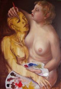 Georgenstrasse, Eisenach, 10.03. - 16.03.2005 ![]() ![]() linke Abbildung: Die Erschaffung Adams, 2004, Öl auf Hartfaser, ca. 90 x 70 cm rechte Abbildung: Bildnis Liane, 2003, Öl auf Leinwand, ca. 90 x 70 cm Die Eröffnung der Ausstellung findet am Donnerstag, den 10. März um 18 Uhr mit der Dezernentin Ute Lieske statt. Die Künstlerin wird anwesend sein. Bis einschließlich 16. März sind die Werke von 10 bis 18 Uhr zu sehen. Die Ausstellung ist eine Initiative der Kunsthistorikerin Sabine Aichele-Elsner (ARTAe . Jena) und wurde unterstützt von Grundstücksgesellschaft Georgenstraße Thomas & Co. KG, CDU Eisenach, BHW, Augustiner-Bräu und der Stadt Eisenach. Der Titel „Die Erschaffung Adams“ stellt den Bezug zum gleichnamigen Bild her. Hier malt eine nackte Frau den ersten Mann namens Adam. Gott wird aus der ursprünglichen Geschichte und Handlung völlig ausgeblendet. Stattdessen rückt die schöpferische Frau an die Stelle Gottes und malt sich den ihren Wünschen entsprechenden Urmann. Die Malerin geht ihrer Sehnsucht nach, liebevoll umarmt zu werden und geborgen auf einem Schoss zu sitzen. Sie hat durch den schöpferischen Akt göttliche Eigenschaften, die allerdings auf der Ebene der Malerei gilt. Neben der Erschaffung Adams, sind Portraits, Allegorien und erzählende Bilder von Claudia Hauptmann zu sehen. In altmeisterlicher Manier, mit Liebe zum Detail, den charakteristischen Blick eines Menschen einfangend, ist die Art wie Claudia Hauptmann Portraits malt. Wiedererkennbar, in Dixscher Art, mit Attributen aus anderen Epochen, vielseitig, nicht nur fröhlich, mit menschlicher Tiefe und etwas dahinterstreckendes, malt sie die Personen, die sich von ihr portraitieren lassen. Claudia Hauptmann setzte sich viel mit dem Mittelalter auseinander und ist von der verspielten Bildwelt fasziniert. Dazu kommt die Begeisterung für die Epoche des Barock, womit die beiden Hintergründe, Einflüsse und Inspirationsquellen benannt sind. In altmeisterlicher Maltechnik, mit ausgesuchten Attributen, verschiedensten Gesten, Haltungen oder Instrumenten präsentiert die Malerin die Figuren. Die Malerin Claudia Hauptmann wurde 1966 in Eisenach geboren. Sie besuchte die Abendakademie der Hochschule für Grafik und Buchkunst in Leipzig von 1985 bis 1988. Zum Studium war sie an der Hochschule für Kunst und Design Burg Giebichenstein Halle von 1990 bis 95. Sie absolvierte ihr Studium bei Gudrun Brüne und war im Anschluss bis 1997 Meisterschülerin bei Gudrun Brüne. Ab ca. 1995 lebte Claudia Hauptmann in dem barocken Gutshaus in Lüskow und baute dies mit Freunden und Bekannten unter denkmalpflegerischen Ansprüchen entsprechend auf. Von 2001 bis 2003 malte die Künstlerin den Gartensaal des Herrenhauses Heinrichsruh in Norddeutschland aus. Seit 2002 lebt und arbeitet Claudia Hauptmann in Potsdam. 2004 hat die Malerin den Kunstpreis des Europäischen Frauenforums Illereichen gewonnen, der mit einem Arbeitsstipendium einhergeht. Sabine Aichele-Elsner Fenster schließen |